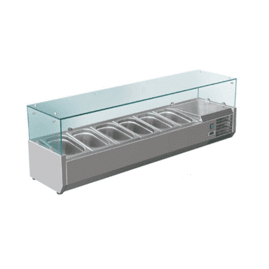 - Takes 6 x 1/3 GN pans or 5 x 1/3 + 1 x 1/2 size, not supplied. Maximum pan depth 150mm