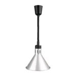 With a modern silver finish and durable hard-wearing design, this Apuro retractable heat shade is a reliable front-of-house solution for holding hot food, whether on a pass or at a self-service buffet station. Suitable for use with 250W heat lamp bulbs (not included), the conical shade’s length is easily adjusted so it sits at the perfect height to keep food warm under its gentle heat bulbs.