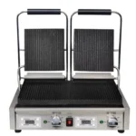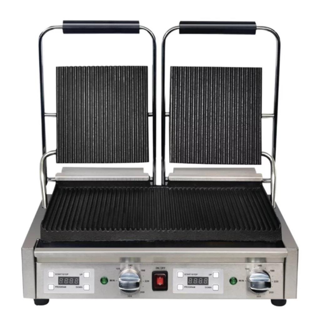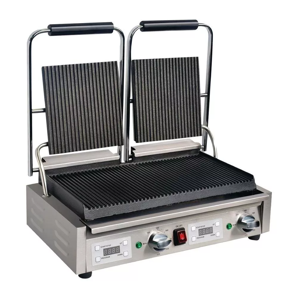 Twin plates, twice the output – you’ll be grilling even more food to perfection when you use this double contact grill from Apuro. The ribbed plates will leave attractive grill marks on your meat or vegetables, and they’ll also help to drain away any excess grease or fat. It’s a far healthier and tastier alternative to pan frying.