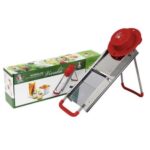Stainless steel construction; Slices, juliennes, makes french fries and matchsticks vegetables; Standard 2mm/10mm blade set; Red Polycarbonate guard for maximum safety in cutting; Non-skid stand.