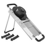 Stainless steel construction; Slices, juliennes, makes french fries, matchsticks vegetables, waffle cuts; Lever adjustment of slice thickness; 4 interchangeable julienne blade blocks – 2mm, 4mm, 7mm & 10mm; Polycarbonate guard for maximum safety in cutting; Non-skid stand.