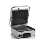 The single panini grill is constructed of cast iron and stainless steel and pyroceram; Adjustable upper plate; Removable drawer for collecting crumbs and grease; Thermostat for temperature setting up to 300°C; Power: 1 Phase; 15amp, 240V.