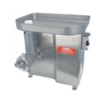 Benchtop meat mincer; stainless steel and anodised aluminium construction to resist corrosion; the cutting group and funnels are made from high grade 18/8 stainless steel; all components radiused and reamed; Reduction gears running in oil bath; Reversing switch to clear blockages. Throughput – up to 250 kg/hr