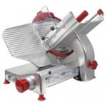 Belt-driven; Blade diameter: 250mm; manual tilting carriage; Micrometric adjusting knob allows for precision slicing up to 16mm; removable sharpener, blade cover and slice deflector for easy cleaning; fully-guarded blade; NVR*; CE approved.