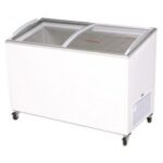 The angle top curved glass chest freezers offer the perfect display for ice cream and frozen food. The curved glass and angel top gives perfect visual display for impulse sales. The sides can be decaled (additional charges apply – POA).
