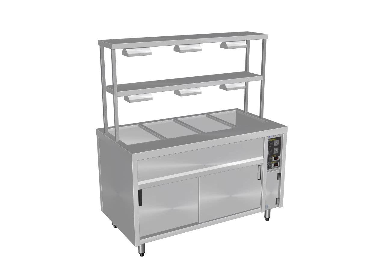 - Unit comes complete with CH.BMH.U bain marie hot cupboard plus island bench top and 2 tier overhead heated gantry fully fitted and wired. Gantry is welded to bench top