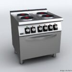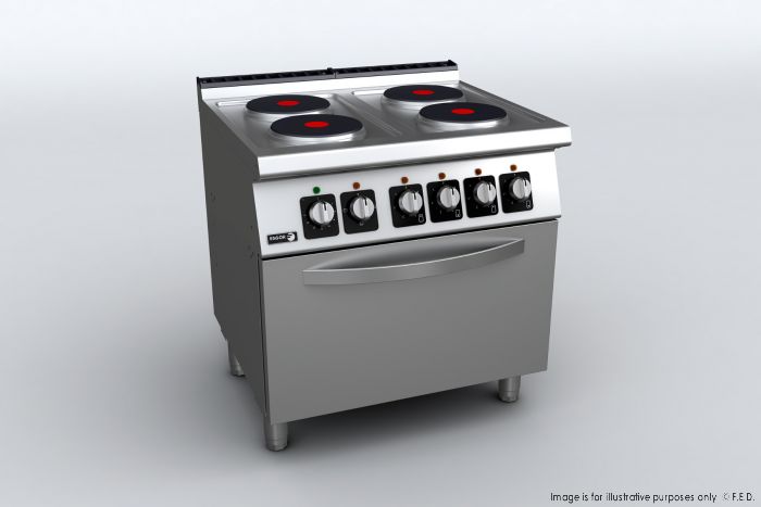 - Four round cast iron hot plates of 223 mm diameter, with 2,6 kw power, hermetically fixed to the deep-drawn surface top.