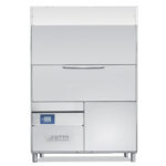 Upright pot washer with heat recovery system.