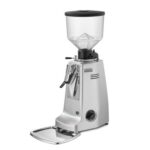 Coffee grinder with flat blades suitable for shops with medium consumption. Stepless micrometrical grinding adjustment. With small bag holder.
