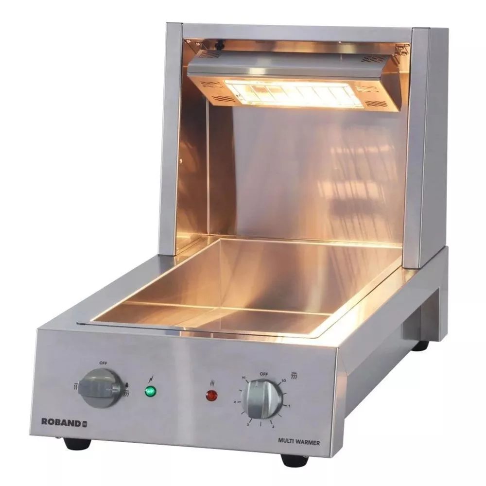 Roband MW10CW multi-function food and chip warmer is a compact bench-top warmer that can accommodate a range of accessories to suit the type of hot food being displayed. With heat source from above (quartz heat lamp) and from below (stainless steel elements), the unit attractively holds and displays hot food, ready for service.