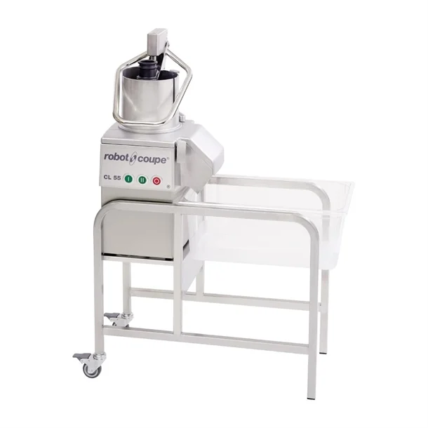 The Robot Coupe CL55 Pusher is a vegetable prep machine meant to handle pounds of even the largest vegetables at a time. Perfect for chopping or slicing entire heads of lettuce, broccoli, or pureeing tomatoes for saucesDurable stainless steel construction ensures that the CL55 can withstand day to day use. The automatic feed head doesn’t use a bowl, so items may be placed directly into the hopper, and the two disc rack makes sure foods are cut thoroughly. Once veggies are sliced, they are ejected into whatever container is placed in front of it, and the CL55 has an auto restart so there’s no need to disrupt the flow of work. A 3 horsepower motor capable of 425 provides more than enough power for continuous everyday use.