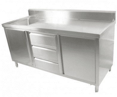 ALL STAINLESS STEEL CABINETS WITH SINK & HANDY DOORS & DRAWERS TO KEEP KITCHENS TIDY AND HIDE CLUTTER