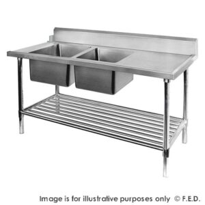 Optimize your dishwashing station with our high-performance stainless steel double bowl dishwash inlet benches. Specifically designed to integrate seamlessly with commercial pass-through dishwashers, these inlet benches provide a dedicated space for soaking, scrubbing, and pre-rinsing. Crafted from heavy-duty, corrosion-resistant stainless steel, they feature a specialized ‘hook-on’ design to ensure a watertight connection to your machine. Enhance your kitchen’s hygiene and speed up your cleanup process with the professional range at Atlantic Equipment