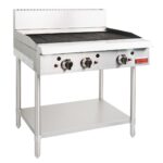 Features include 3 burners, heavy cast iron grilling grates, manually-controlled independent cooking zones, robust dial controls, adjustable heavy feet and burner safety valves for peace of mind. Also has a removable waste tray for easy maintenance and cleaning. Supplied with stand.