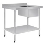 Constructed from robust stainless steel, this sink comes supplied with stand, shelf and waste. Also featuring a right hand bowl and left hand drainer to suit any commercial kitchen. The galvanised steel under shelf provides you with extra storage space allowing you to keep a tidy kitchen. Delivered flat packed for easy assembly. 900mm high with 60mm upstand. Taps not included.