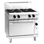 - Cast iron 28MJ/hr open burners with forged brass cap