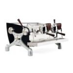 Electronic coffee machine. High cup group – 122mm. Four programmable doses per group, with manual brewing button. Two chromed steam wands. One manual hot water tap. Water auto-fill, built in rotary pump.