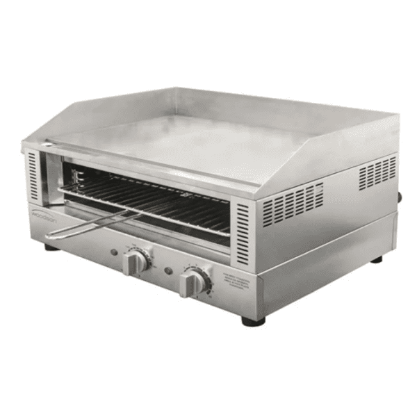 Featuring a 8mm thick cast steel griddle plate, and an adjustable toasting rack, the Woodson Large Griddle Toaster provides an evenly heated cooking surface, together with a high performance toaster. An integrated splashback assists in containing any food or oil splashing, while a manual twin thermostat control enables the preferred temperature to be selected on either the top plate or in the griller. Reliable and versatile, this unit is a definite asset to all commercial kitchens.
