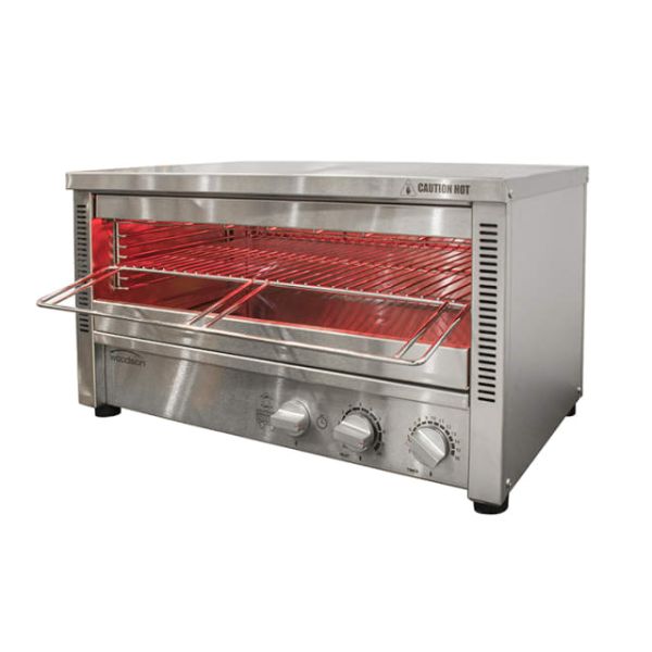 With a fifteen slice capacity, the Woodson Glass Element Salamander is the perfect size for a busy, quick service kitchen. The ‘instant’ heat infrared glass top elements delivers energy efficiency, while providing strength and durability. Two operation modes, timer controlled and manual control with rack activated switch, offers users a quick and easy to use system. This unit is easy to maintain, safe to use and extremely reliable.