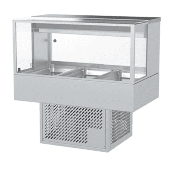Unique, efficient and seamlessly crafted, the Woodson 2 row, 3 bay Square Glass Cold Food Display is constructed from double glazed, toughened glass. The high quality refrigeration comprises of a unique air design that utilises a cold plate and cross fin coil, ensuring cold air surrounds the products at all times. Top mounted LED lights, ensure optimal product display is achieved at all times. The result is an effective, eye-catching product display, with high quality results.