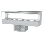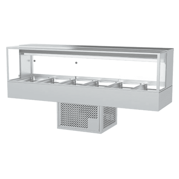 Unique, efficient and seamlessly crafted, the Woodson 2 row, 6 bay Square Glass Cold Food Display is constructed from double glazed, toughened glass. The high quality refrigeration comprises of a unique air design that utilises a cold plate and cross fin coil, ensuring cold air surrounds the products at all times. Top mounted LED lights, ensure optimal product display is achieved at all times. The result is an effective, eye-catching product display, with high quality results.